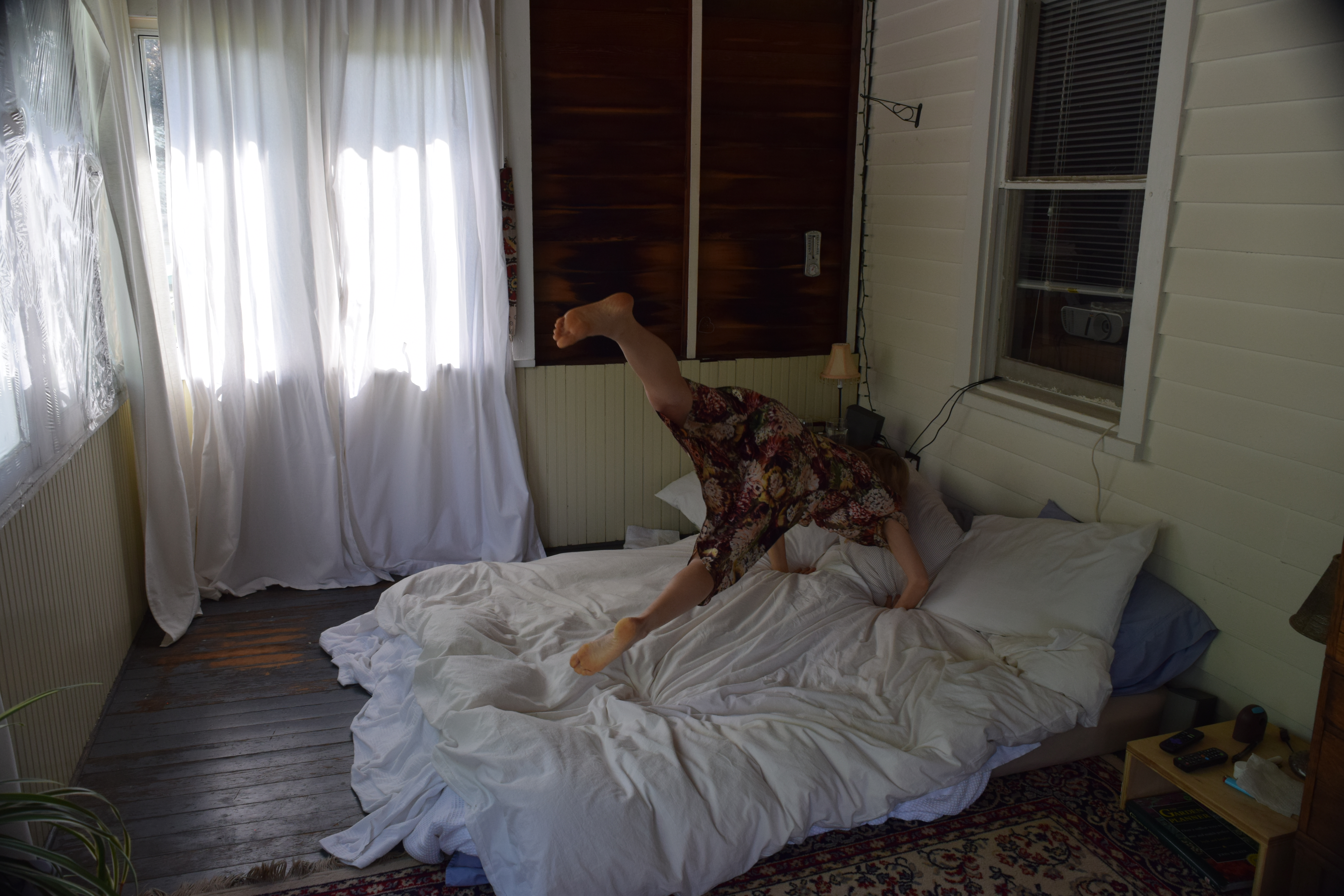 It can be a sort of game to become so quiet in a house that you don’t even believe you are there yourself. I tried this with her; got really quiet and sank into the bed to let her run around so I could watch her.